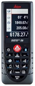 The newest and the most versatile laser distance meter from Leica! Equipped with a digital pointfinder, high-resolution 2.4-Inch colour display, 360-Degree tilt sensor and bluetooth technology, the Leica DISTO D8 is a real world first and offers completely new measuring options. The combination of angle and distance measurements allows you to determine distances where conventional methods fail. The horizontal distance, for example, can also be determined quickly and efficiently past obstacles or the elevation of a tree, even though there is no reflective point. Thanks to the digital pointfinder with its 4x zoom and high resolution 2.4-Inch colour display, you can measure long range distances quickly and easily because you always see your targeted point. With integrated Bluetooth technology, measurement results can be wirelessly and accurately transferred to pocket PCs and PCs. Thus you can easily process your data in Excel, Word, AutoCAD and other programs. The delivery package contains the transfer software "Leica DISTO Transfer" – easy to install and with automatic updates. The AutoCAD plug-in additionally allows convenient planning and drawing with your AutoCAD software. Measuring range of 0.05-Meter - 0.16-Feet up to 200-Meter - 650-Feet; typ. accuracy ± 1.0 mm - ± 0.04-Inch. Includes; holster, hand loop, 2 AA batteries, target plate, manual with safety instructions, producer certificate M in accordance with DIN 55350-18-4.2.2, quickstart guide, and CD with Leica DISTO Transfer for PC and PPC, AutoCAD PlugIn.